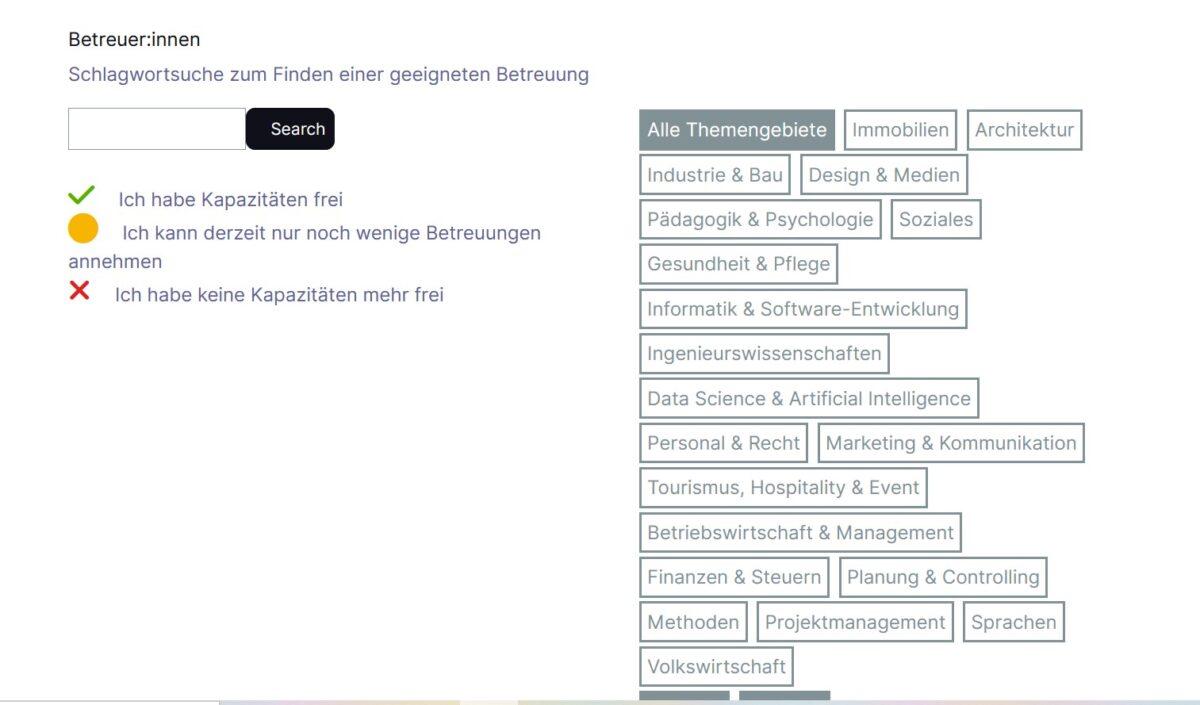 Auf myCampus findest du das Betreuerboard unter „Informationen Abschlussarbeit Allgemein“ im Infocenter. Hier findest du eine Auswahl an Tutoren, die die Betreuung von Bachelorarbeiten an der IU übernehmen. Auf der Seite ist in Grün, Gelb oder Rot gekennzeichnet, ob der jeweilige Betreuer noch Kapazitäten hat. Mit der Schlagwortsuche kannst du herausarbeiten, welche Tutoren für deine Thematik infrage kommen.